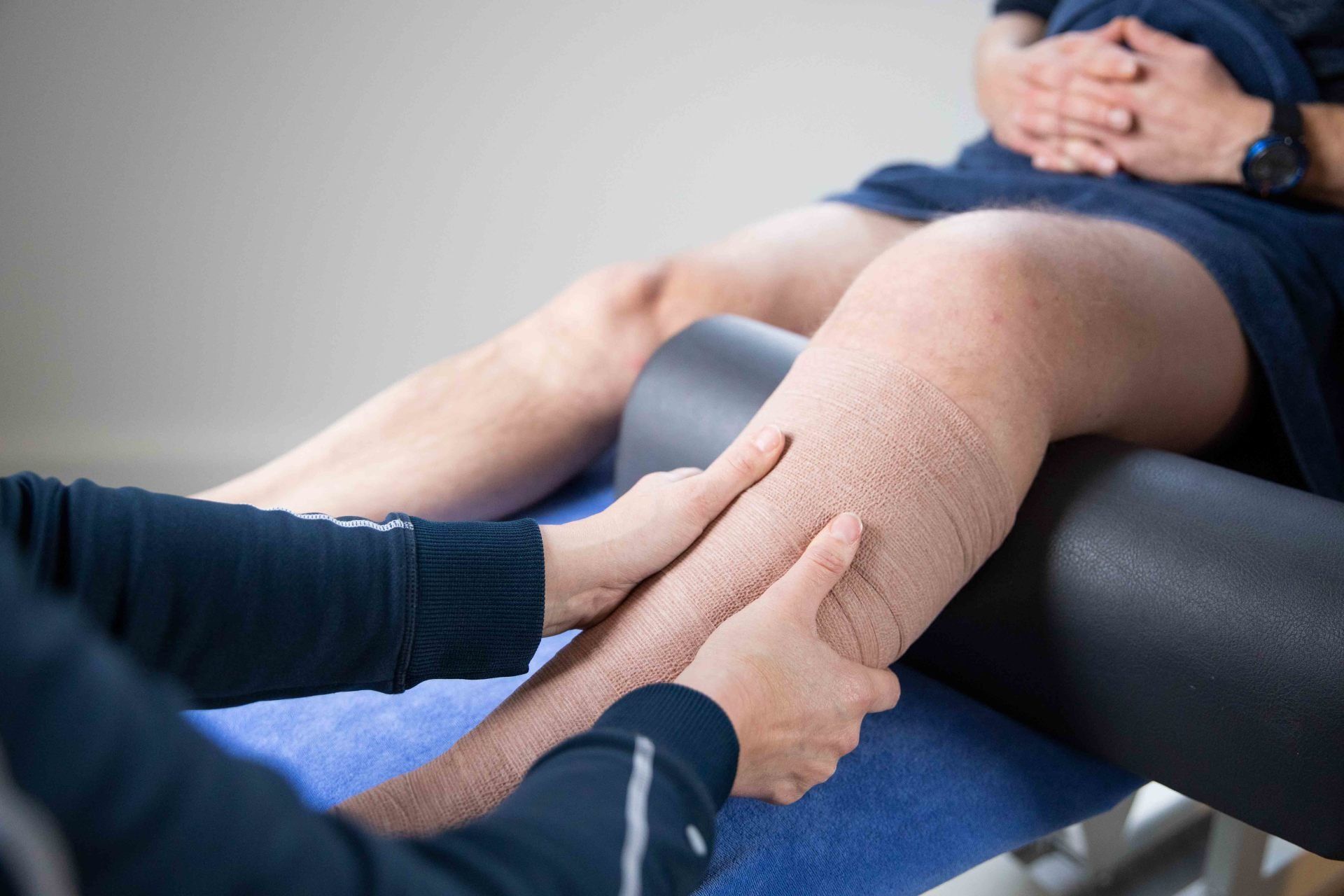 Door middel van het aanleggen van bandages wordt van buitenaf een continue druk aangebracht die het uittreden van vocht tegengaat en de afvoer van lymfe ondersteunt. De bandages worden aangelegd als er nog geen stabiele situatie in de waterhuishouding is bereikt. Wanneer de omvang van de arm of het been stabiel is, kan een therapeutische elastische kous worden aangemeten. Je wordt hierin door onze oedeemtherapeuten geadviseerd en geïnstrueerd.