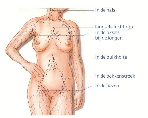Het lymfestelsel loopt door het hele lichaam en voert afvalstoffen en eiwitten af. Het lymfestelsel bestaat uit lymfevaten en lymfeknopen die een zuiverende werking hebben. Met name in de hals, oksels, liezen en buik zitten veel lymfeknopen.
